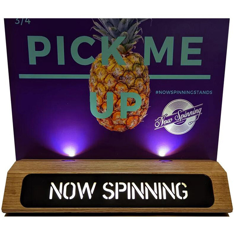 Este soporte de exhibición de la muestra del LED se hace de la madera y del PVC con la iluminación del LED. Hay dos luces LED en la base para destacar el gráfico del PVC. Además, usted puede cambiar las letras en frente, que también se hacen excursionismo. El gráfico del PVC es permutable, así que el tamaño que embala es pequeño.